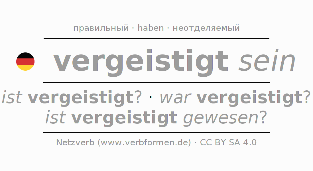 - Презенс: sei ich vergeistigt?, seiest du vergeistigt?, sei er vergeistigt?, seien wir vergeistigt?, seiet ihr vergeistigt?, seien sie vergeistigt?