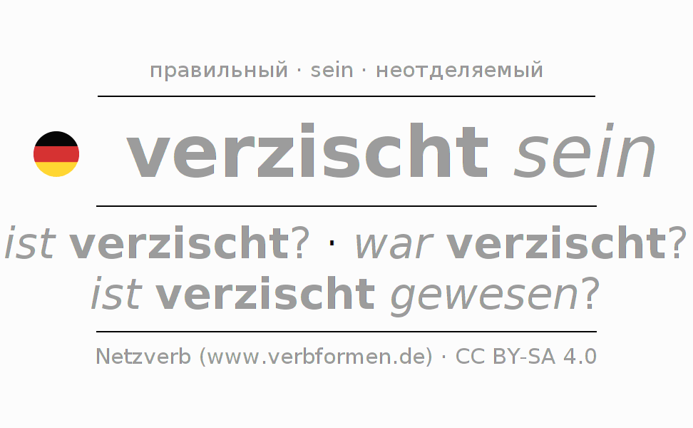 - Презенс: sei ich verzischt?, seiest du verzischt?, sei er verzischt?, seien wir verzischt?, seiet ihr verzischt?, seien sie verzischt?