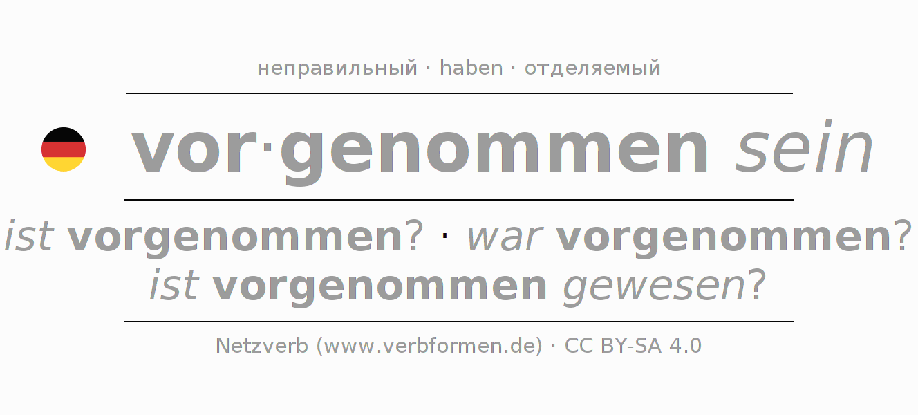 Спряжение глагола vornehmen (намереваться, предпринять) неправильное. Формы глагола ist vorgenommen?, war vorgenommen?, ist vorgenommen gewesen?. Чередующиеся гласные e - a - o в корне: В качестве вспомогательного глагола к vornehmen употребляется "haben". Приставка vor- для vornehmen отделяемая. Склоняется в Пассив с sein и употребляется в Вопросительное предложение. Для лучшего понимания приводится большое количество примеров употребления глагола vornehmen. Для тренировки и закрепления навыков имеются также бесплатные рабочие листы по vornehmen. Можно не только vornehmen спрягать, но и все немецкие глаголы. Глагол включён в словарный запас обладателя сертификата знания немецкого языка уровня B1. Kомментарии ☆
