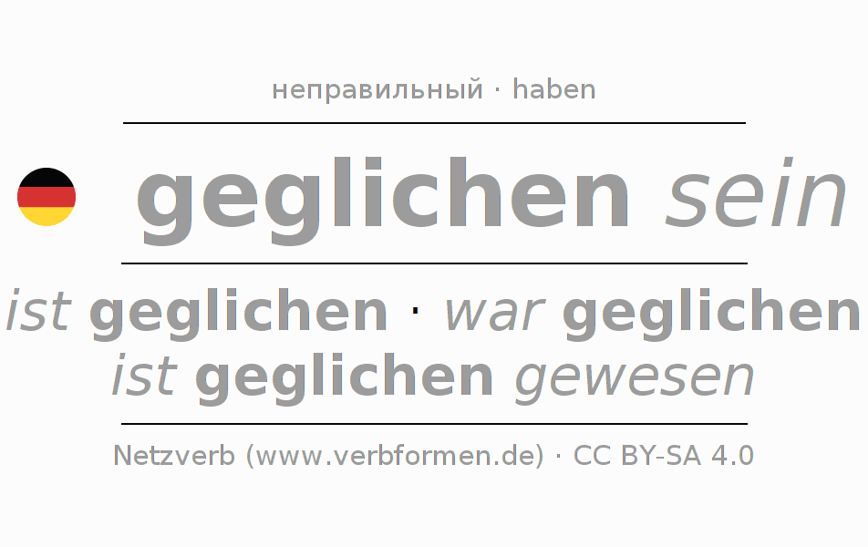 - Перфект: ich bin geglichen gewesen, du bist geglichen gewesen, er ist geglichen gewesen, wir sind geglichen gewesen, ihr seid geglichen gewesen, sie sind geglichen gewesen