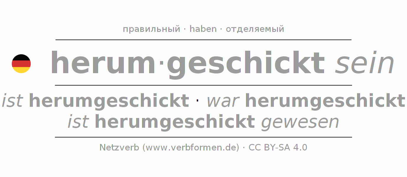 Глагол 'herum·geschickt sein' онлайн как таблица глаголов со всеми наглядно представленными формами. Значение глагола herum·geschickt sein таким образом является помощью для выполнения домашних заданий; подготовки к экзаменам и контрольным работам, а также к урокам немецкого языка; для обучения в вузах и при получении образования для взрослых. Именно для изучающих немецкий язык – правильное спряжение глаголов (ist herumgeschickt - war herumgeschickt - ist herumgeschickt gewesen) является решающим фактором.
