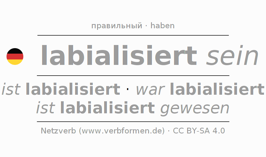 - Перфект: ich bin labialisiert gewesen, du bist labialisiert gewesen, er ist labialisiert gewesen, wir sind labialisiert gewesen, ihr seid labialisiert gewesen, sie sind labialisiert gewesen