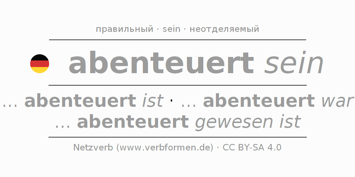 - Презенс: ... ich abenteuert bin, ... du abenteuert bist, ... er abenteuert ist, ... wir abenteuert sind, ... ihr abenteuert seid, ... sie abenteuert sind