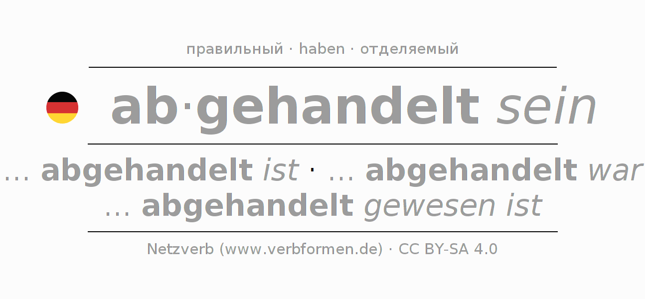 - Презенс: ... ich abgehandelt bin, ... du abgehandelt bist, ... er abgehandelt ist, ... wir abgehandelt sind, ... ihr abgehandelt seid, ... sie abgehandelt sind