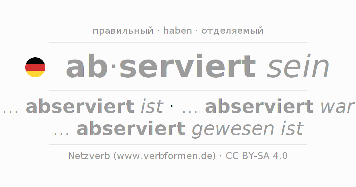 - Презенс: ... ich abserviert bin, ... du abserviert bist, ... er abserviert ist, ... wir abserviert sind, ... ihr abserviert seid, ... sie abserviert sind