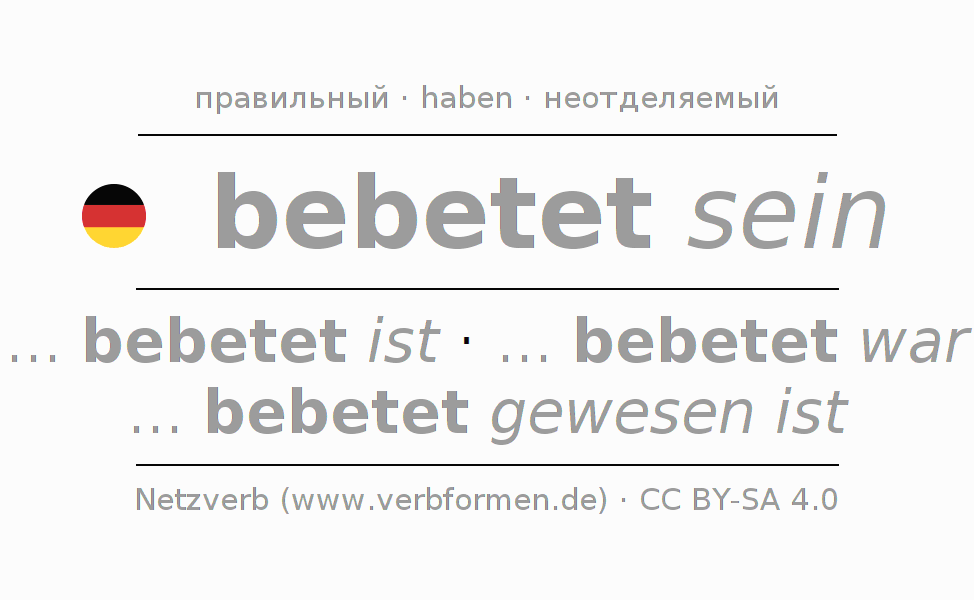 Глагол 'bebetet sein' онлайн как таблица глаголов со всеми наглядно представленными формами. Значение глагола bebetet sein таким образом является помощью для выполнения домашних заданий; подготовки к экзаменам и контрольным работам, а также к урокам немецкого языка; для обучения в вузах и при получении образования для взрослых. Именно для изучающих немецкий язык – правильное спряжение глаголов (... bebetet ist - ... bebetet war - ... bebetet gewesen ist) является решающим фактором.