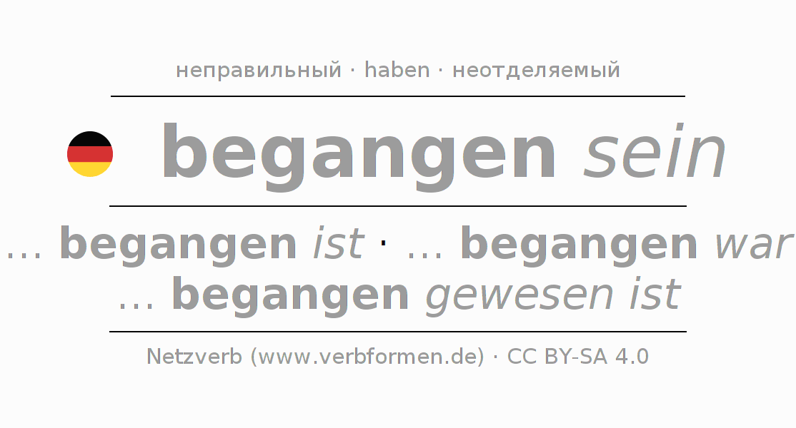 Глагол 'begangen sein' онлайн как таблица глаголов со всеми наглядно представленными формами. Значение глагола begangen sein таким образом является помощью для выполнения домашних заданий; подготовки к экзаменам и контрольным работам, а также к урокам немецкого языка; для обучения в вузах и при получении образования для взрослых. Именно для изучающих немецкий язык – правильное спряжение глаголов (... begangen ist - ... begangen war - ... begangen gewesen ist) является решающим фактором.
