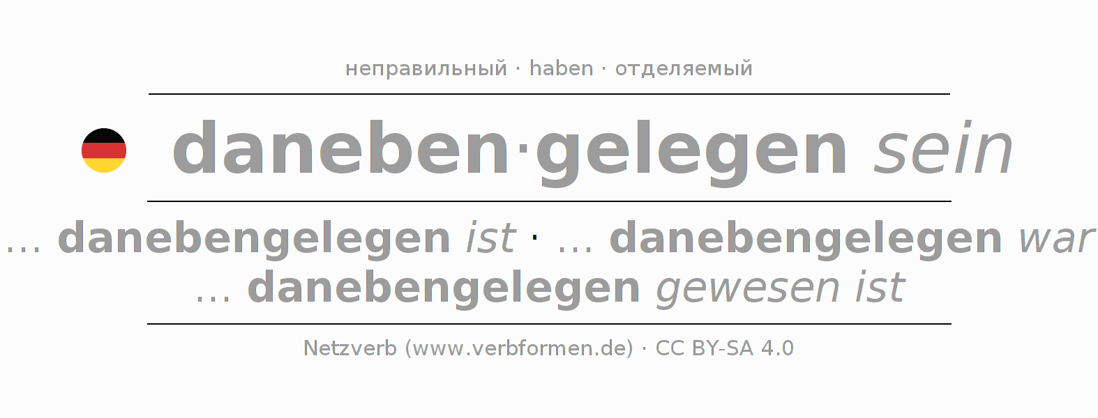 - Презенс: ... ich danebengelegen bin, ... du danebengelegen bist, ... er danebengelegen ist, ... wir danebengelegen sind, ... ihr danebengelegen seid, ... sie danebengelegen sind