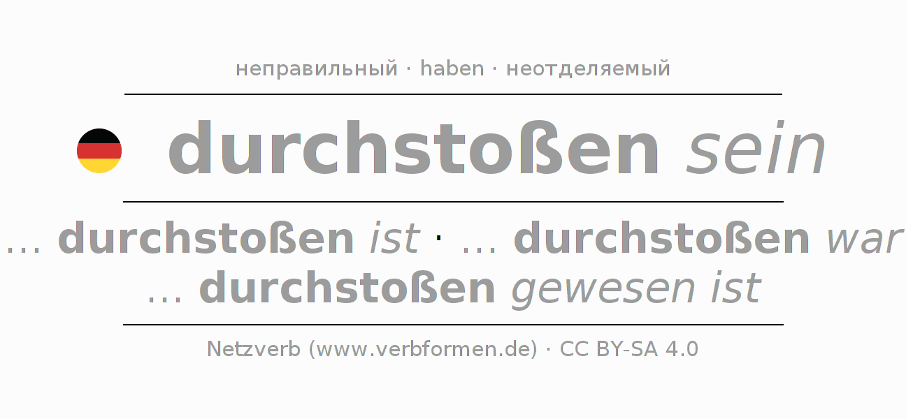 - Презенс: ... ich durchstoßen bin, ... du durchstoßen bist, ... er durchstoßen ist, ... wir durchstoßen sind, ... ihr durchstoßen seid, ... sie durchstoßen sind