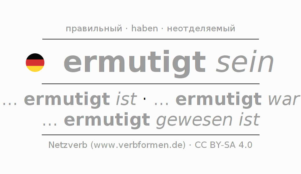 Спряжение глагола ermutigen (ободрять, вдохновить) правильное. Формы глагола ... ermutigt ist, ... ermutigt war, ... ermutigt gewesen ist. В качестве вспомогательного глагола к ermutigen употребляется "haben". Приставка er- для ermutigen неотделяемая. Склоняется в Пассив с sein и употребляется в Придаточное предложение. Для лучшего понимания приводится большое количество примеров употребления глагола ermutigen. Для тренировки и закрепления навыков имеются также бесплатные рабочие листы по ermutigen. Можно не только ermutigen спрягать, но и все немецкие глаголы. Глагол включён в словарный запас обладателя сертификата знания немецкого языка уровня B2. Kомментарии ☆
