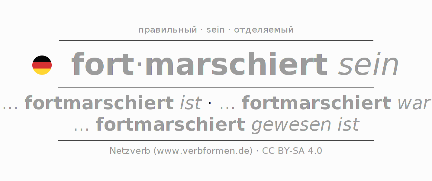 - Презенс: ... ich fortmarschiert bin, ... du fortmarschiert bist, ... er fortmarschiert ist, ... wir fortmarschiert sind, ... ihr fortmarschiert seid, ... sie fortmarschiert sind