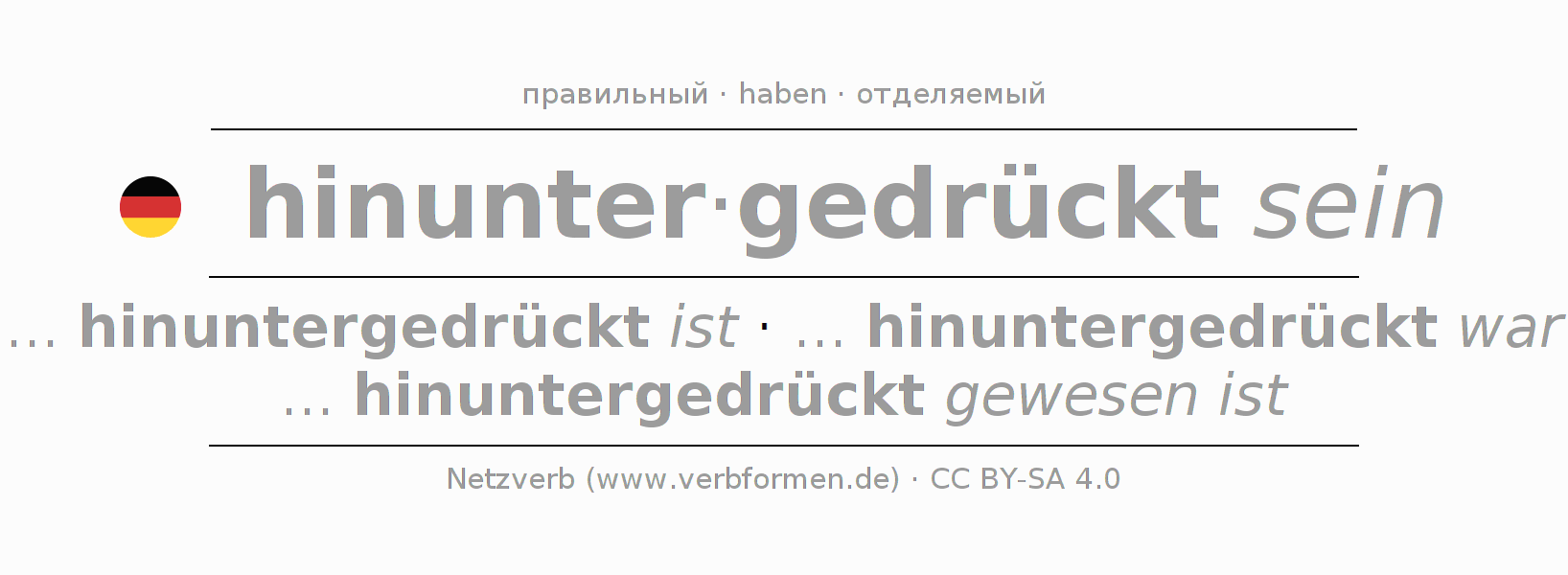 - Презенс: ... ich hinuntergedrückt bin, ... du hinuntergedrückt bist, ... er hinuntergedrückt ist, ... wir hinuntergedrückt sind, ... ihr hinuntergedrückt seid, ... sie hinuntergedrückt sind