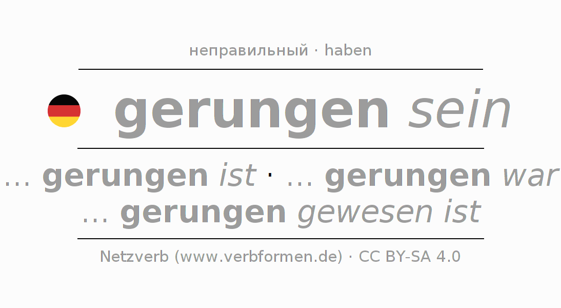 Глагол 'gerungen sein' онлайн как таблица глаголов со всеми наглядно представленными формами. Значение глагола gerungen sein таким образом является помощью для выполнения домашних заданий; подготовки к экзаменам и контрольным работам, а также к урокам немецкого языка; для обучения в вузах и при получении образования для взрослых. Именно для изучающих немецкий язык – правильное спряжение глаголов (... gerungen ist - ... gerungen war - ... gerungen gewesen ist) является решающим фактором.
