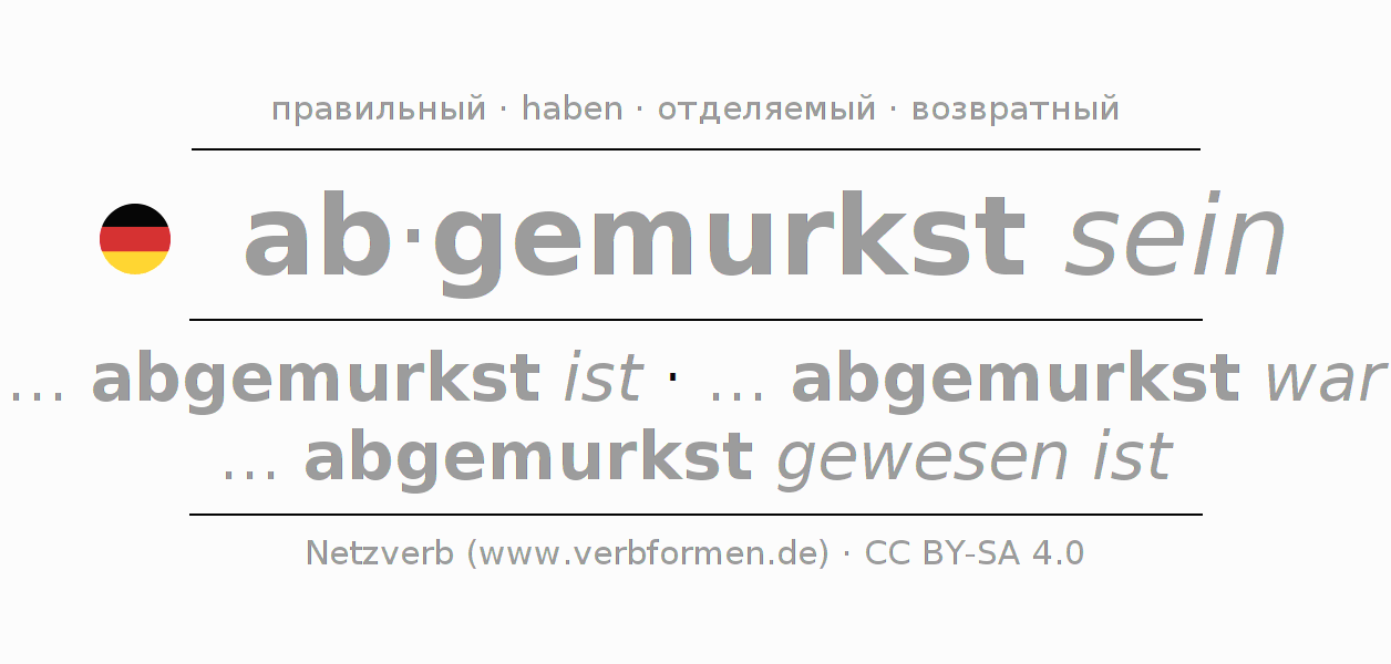 Глагол 'ab·gemurkst sein' онлайн как таблица глаголов со всеми наглядно представленными формами. Значение глагола ab·gemurkst sein таким образом является помощью для выполнения домашних заданий; подготовки к экзаменам и контрольным работам, а также к урокам немецкого языка; для обучения в вузах и при получении образования для взрослых. Именно для изучающих немецкий язык – правильное спряжение глаголов (... abgemurkst ist - ... abgemurkst war - ... abgemurkst gewesen ist) является решающим фактором.