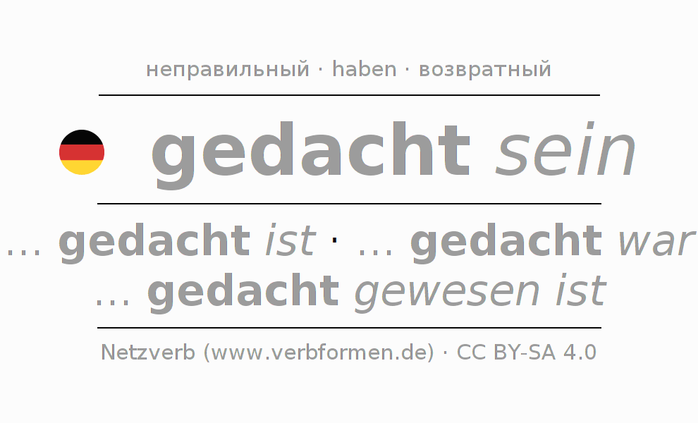 Глагол 'gedacht sein' онлайн как таблица глаголов со всеми наглядно представленными формами. Значение глагола gedacht sein таким образом является помощью для выполнения домашних заданий; подготовки к экзаменам и контрольным работам, а также к урокам немецкого языка; для обучения в вузах и при получении образования для взрослых. Именно для изучающих немецкий язык – правильное спряжение глаголов (... gedacht ist - ... gedacht war - ... gedacht gewesen ist) является решающим фактором.