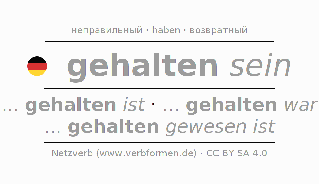 Глагол 'gehalten sein' онлайн как таблица глаголов со всеми наглядно представленными формами. Значение глагола gehalten sein таким образом является помощью для выполнения домашних заданий; подготовки к экзаменам и контрольным работам, а также к урокам немецкого языка; для обучения в вузах и при получении образования для взрослых. Именно для изучающих немецкий язык – правильное спряжение глаголов (... gehalten ist - ... gehalten war - ... gehalten gewesen ist) является решающим фактором.