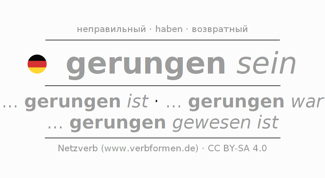 Глагол 'gerungen sein' онлайн как таблица глаголов со всеми наглядно представленными формами. Значение глагола gerungen sein таким образом является помощью для выполнения домашних заданий; подготовки к экзаменам и контрольным работам, а также к урокам немецкого языка; для обучения в вузах и при получении образования для взрослых. Именно для изучающих немецкий язык – правильное спряжение глаголов (... gerungen ist - ... gerungen war - ... gerungen gewesen ist) является решающим фактором.
