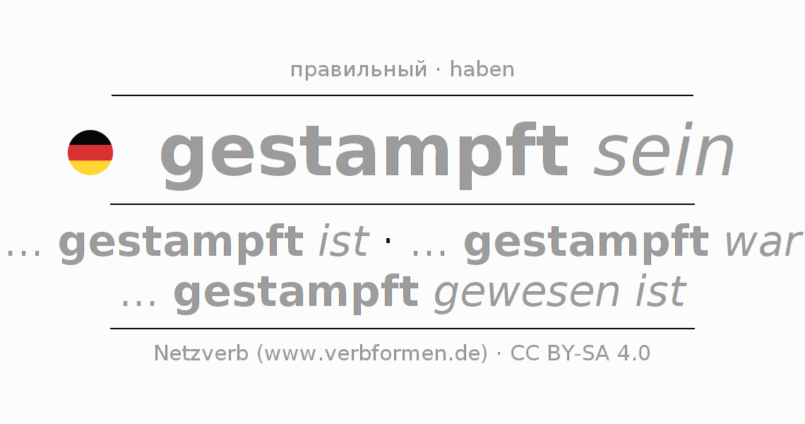 Спряжение глагола stampfen (трамбовать, истолочь) правильное. Формы глагола ... gestampft ist, ... gestampft war, ... gestampft gewesen ist. В качестве вспомогательного глагола к stampfen употребляется "haben". Однако имеются временные формы со вспомогательным глаголом sein. Склоняется в Пассив с sein и употребляется в Придаточное предложение. Для лучшего понимания приводится большое количество примеров употребления глагола stampfen. Для тренировки и закрепления навыков имеются также бесплатные рабочие листы по stampfen. Можно не только stampfen спрягать, но и все немецкие глаголы. Глагол включён в словарный запас обладателя сертификата знания немецкого языка уровня C2. Kомментарии ☆