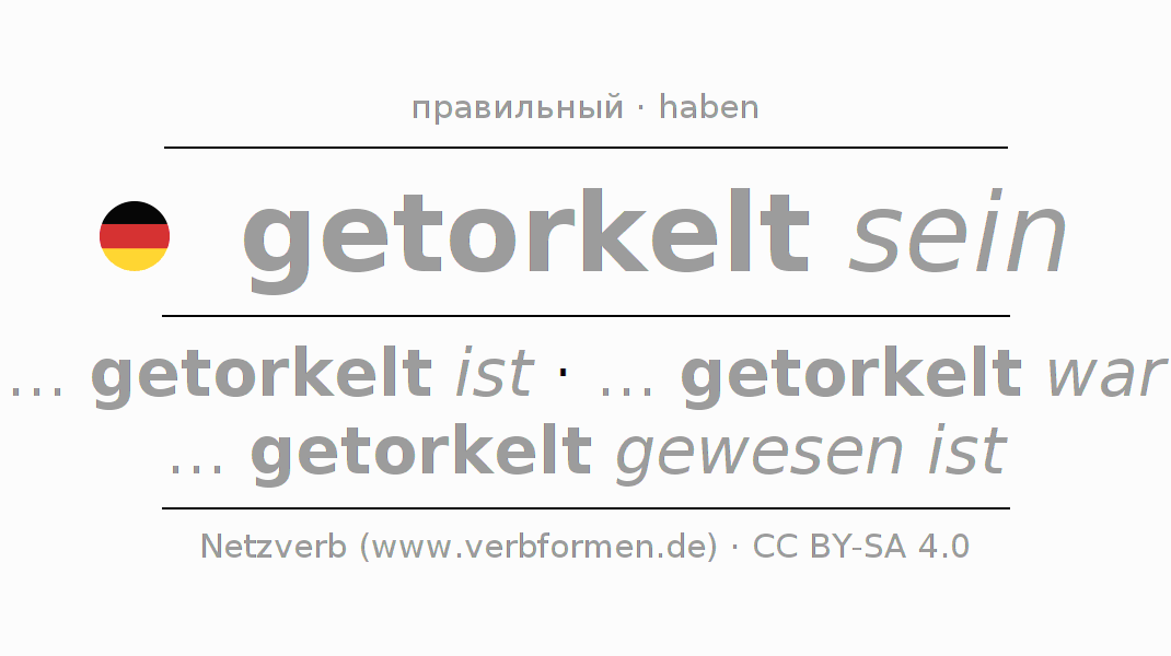 Глагол 'getorkelt sein' онлайн как таблица глаголов со всеми наглядно представленными формами. Значение глагола getorkelt sein таким образом является помощью для выполнения домашних заданий; подготовки к экзаменам и контрольным работам, а также к урокам немецкого языка; для обучения в вузах и при получении образования для взрослых. Именно для изучающих немецкий язык – правильное спряжение глаголов (... getorkelt ist - ... getorkelt war - ... getorkelt gewesen ist) является решающим фактором.