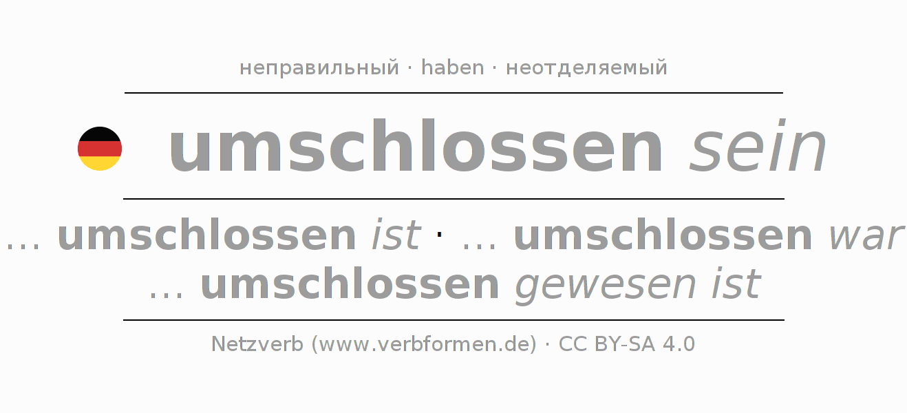 Глагол 'umschlossen sein' онлайн как таблица глаголов со всеми наглядно представленными формами. Значение глагола umschlossen sein таким образом является помощью для выполнения домашних заданий; подготовки к экзаменам и контрольным работам, а также к урокам немецкого языка; для обучения в вузах и при получении образования для взрослых. Именно для изучающих немецкий язык – правильное спряжение глаголов (... umschlossen ist - ... umschlossen war - ... umschlossen gewesen ist) является решающим фактором.
