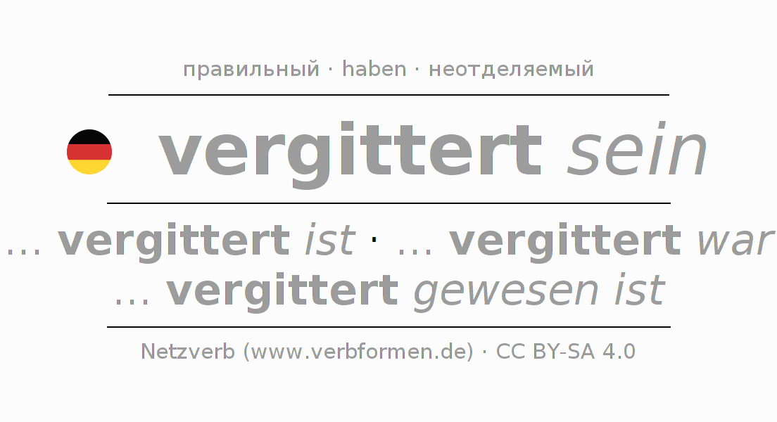 Спряжение глагола vergittern (заделать решёткой, заделывать решёткой) правильное. Формы глагола ... vergittert ist, ... vergittert war, ... vergittert gewesen ist. В качестве вспомогательного глагола к vergittern употребляется "haben". Приставка ver- для vergittern неотделяемая. Склоняется в Пассив с sein и употребляется в Придаточное предложение. Для лучшего понимания приводится большое количество примеров употребления глагола vergittern. Для тренировки и закрепления навыков имеются также бесплатные рабочие листы по vergittern. Можно не только vergittern спрягать, но и все немецкие глаголы. Глагол включён в словарный запас обладателя сертификата знания немецкого языка уровня C2. Kомментарии ☆