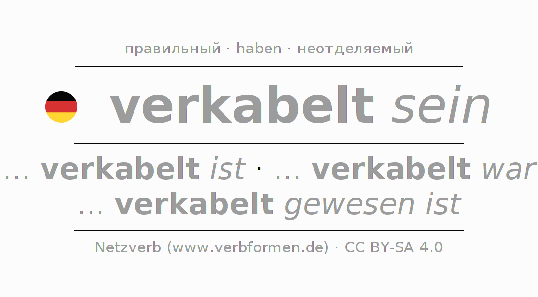 - Презенс: ... ich verkabelt bin, ... du verkabelt bist, ... er verkabelt ist, ... wir verkabelt sind, ... ihr verkabelt seid, ... sie verkabelt sind