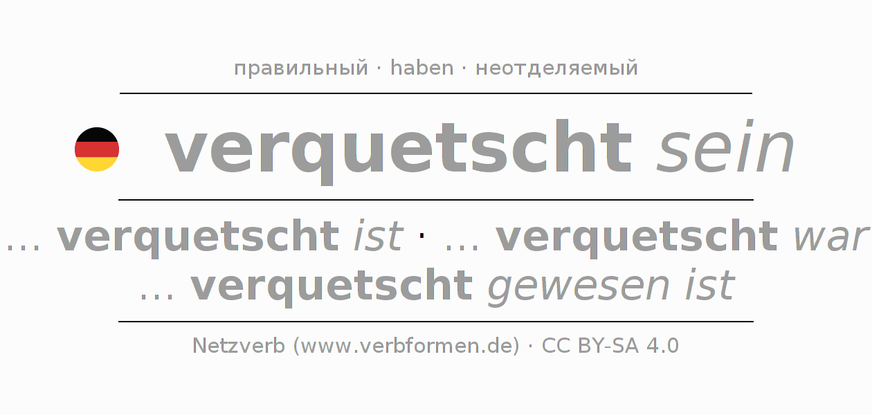 - Презенс: ... ich verquetscht bin, ... du verquetscht bist, ... er verquetscht ist, ... wir verquetscht sind, ... ihr verquetscht seid, ... sie verquetscht sind