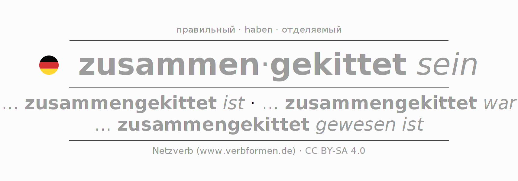 - Перфект: ... ich zusammengekittet gewesen bin, ... du zusammengekittet gewesen bist, ... er zusammengekittet gewesen ist, ... wir zusammengekittet gewesen sind, ... ihr zusammengekittet gewesen seid, ... sie zusammengekittet gewesen sind