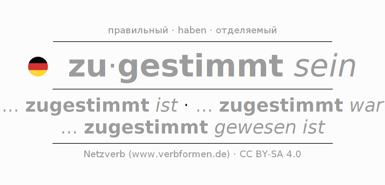 Спряжение глагола zustimmen (одобрить, одобрять) правильное. Формы глагола ... zugestimmt ist, ... zugestimmt war, ... zugestimmt gewesen ist. В качестве вспомогательного глагола к zustimmen употребляется "haben". Приставка zu- для zustimmen отделяемая. Склоняется в Пассив с sein и употребляется в Придаточное предложение. Для лучшего понимания приводится большое количество примеров употребления глагола zustimmen. Для тренировки и закрепления навыков имеются также бесплатные рабочие листы по zustimmen. Можно не только zustimmen спрягать, но и все немецкие глаголы. Глагол включён в словарный запас обладателя сертификата знания немецкого языка уровня A2. Kомментарии ☆