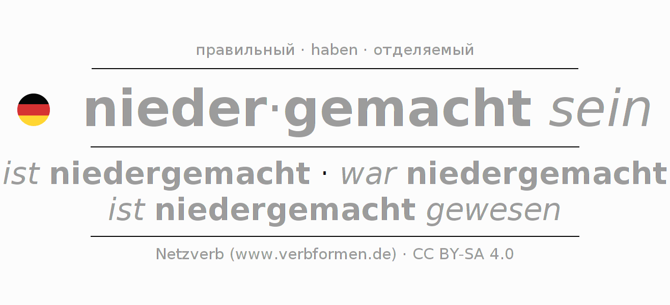 - Перфект: ich bin niedergemacht gewesen, du bist niedergemacht gewesen, er ist niedergemacht gewesen, wir sind niedergemacht gewesen, ihr seid niedergemacht gewesen, sie sind niedergemacht gewesen
