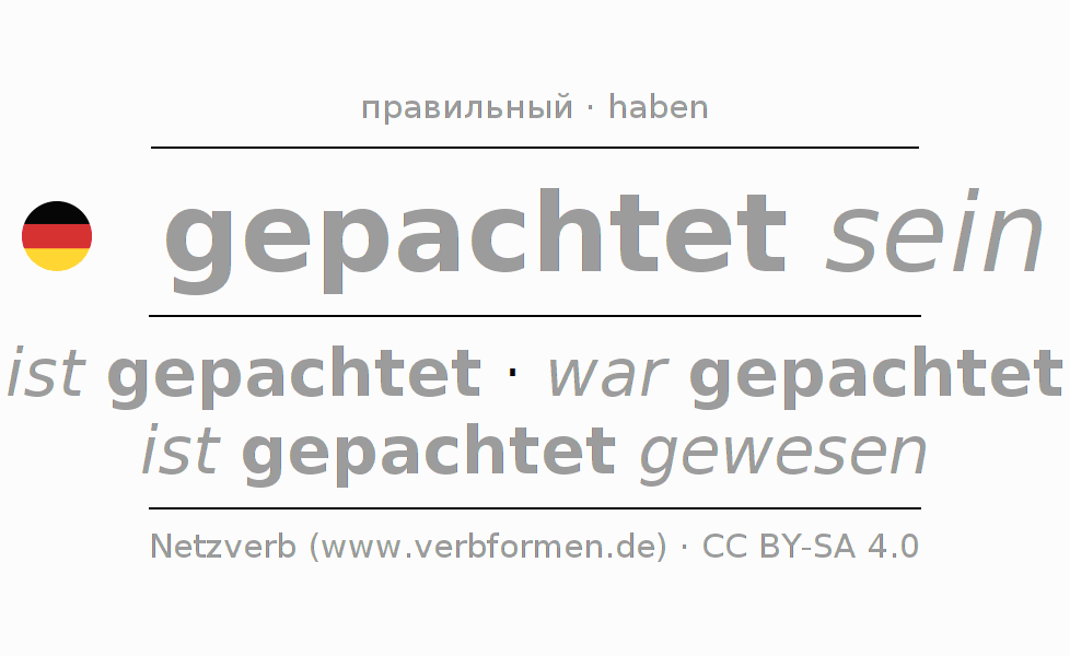 Глагол 'gepachtet sein' онлайн как таблица глаголов со всеми наглядно представленными формами. Значение глагола gepachtet sein таким образом является помощью для выполнения домашних заданий; подготовки к экзаменам и контрольным работам, а также к урокам немецкого языка; для обучения в вузах и при получении образования для взрослых. Именно для изучающих немецкий язык – правильное спряжение глаголов (ist gepachtet - war gepachtet - ist gepachtet gewesen) является решающим фактором.