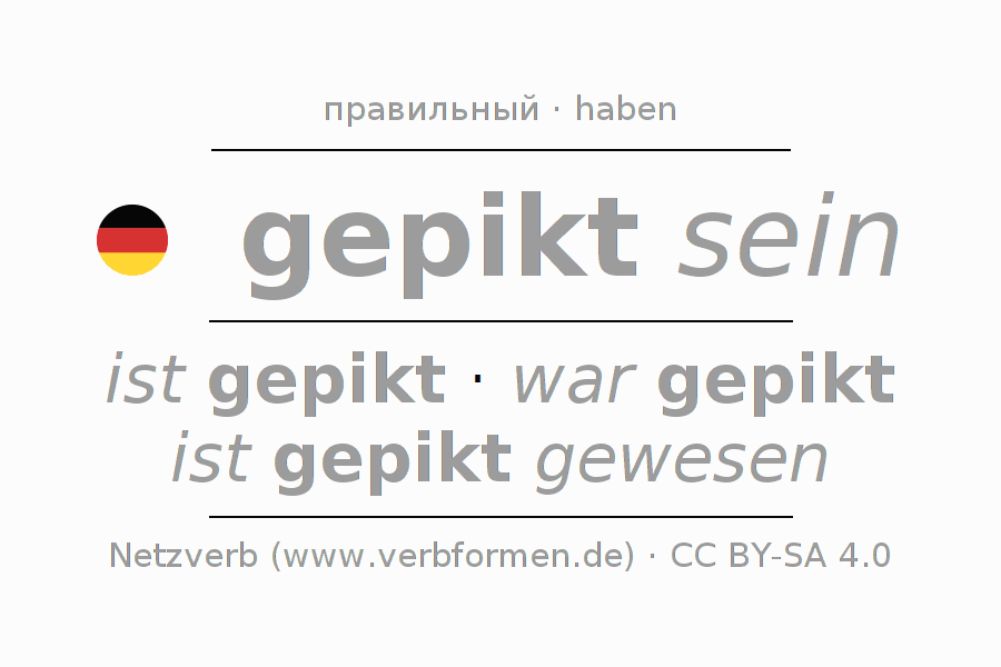 - Презенс: ich bin gepikt, du bist gepikt, er ist gepikt, wir sind gepikt, ihr seid gepikt, sie sind gepikt