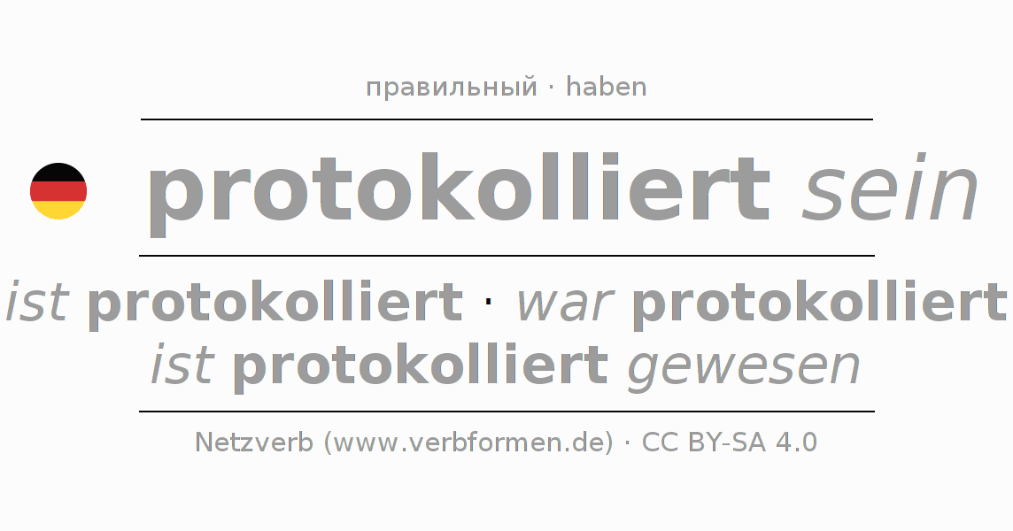 - Презенс: ich bin protokolliert, du bist protokolliert, er ist protokolliert, wir sind protokolliert, ihr seid protokolliert, sie sind protokolliert