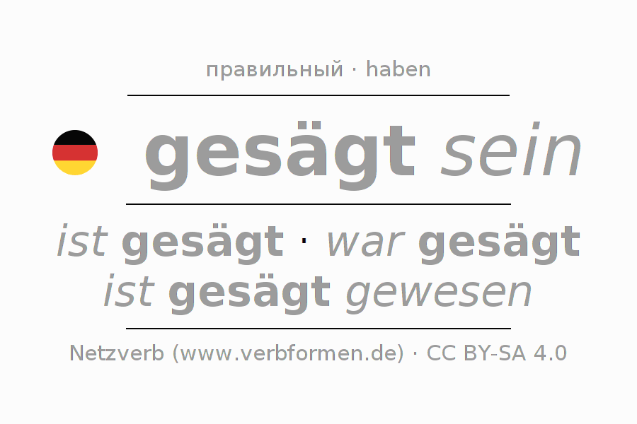Глагол 'gesägt sein' онлайн как таблица глаголов со всеми наглядно представленными формами. Значение глагола gesägt sein таким образом является помощью для выполнения домашних заданий; подготовки к экзаменам и контрольным работам, а также к урокам немецкого языка; для обучения в вузах и при получении образования для взрослых. Именно для изучающих немецкий язык – правильное спряжение глаголов (ist gesägt - war gesägt - ist gesägt gewesen) является решающим фактором.