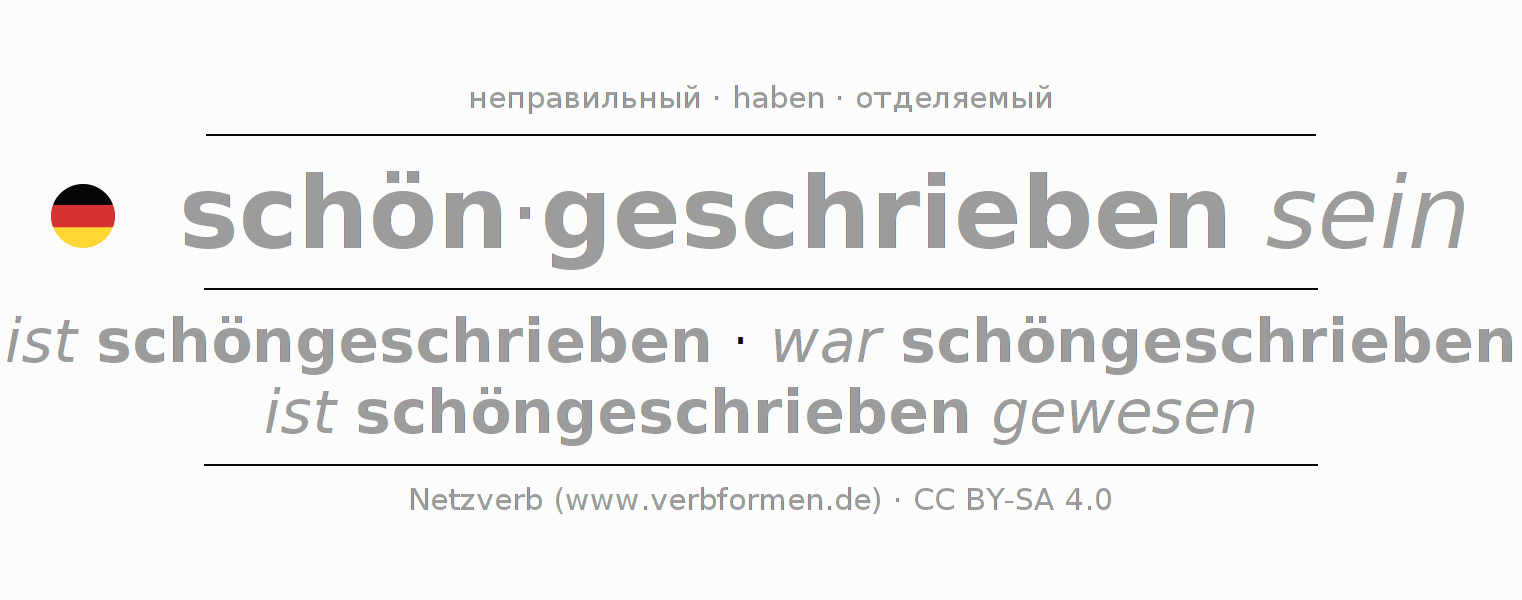 Глагол 'schön·geschrieben sein' онлайн как таблица глаголов со всеми наглядно представленными формами. Значение глагола schön·geschrieben sein таким образом является помощью для выполнения домашних заданий; подготовки к экзаменам и контрольным работам, а также к урокам немецкого языка; для обучения в вузах и при получении образования для взрослых. Именно для изучающих немецкий язык – правильное спряжение глаголов (ist schöngeschrieben - war schöngeschrieben - ist schöngeschrieben gewesen) является решающим фактором.