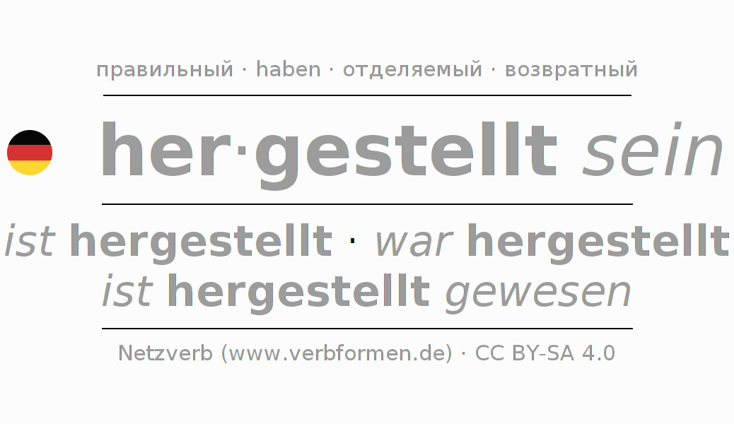 Спряжение глагола herstellen (производить, изготавливать) правильное. Формы глагола ist hergestellt, war hergestellt, ist hergestellt gewesen. В качестве вспомогательного глагола к sich herstellen употребляется "haben". Глагол sich herstellen употреблён в возвратной форме. Может употреблятьсяи невозвратная форма глагола. Приставка her- для sich herstellen отделяемая. Склоняется в Пассив с sein и употребляется в Главное предложение. Для лучшего понимания приводится большое количество примеров употребления глагола herstellen. Для тренировки и закрепления навыков имеются также бесплатные рабочие листы по herstellen. Можно не только sich herstellen спрягать, но и все немецкие глаголы. Глагол включён в словарный запас обладателя сертификата знания немецкого языка уровня A2. Kомментарии ☆