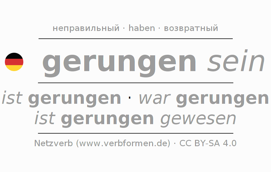 Спряжение глагола ringen (бороться, сражаться) неправильное. Формы глагола ist gerungen, war gerungen, ist gerungen gewesen. Чередующиеся гласные i - a - u в корне: В качестве вспомогательного глагола к sich ringen употребляется "haben". Глагол sich ringen употреблён в возвратной форме. Может употреблятьсяи невозвратная форма глагола. Склоняется в Пассив с sein и употребляется в Главное предложение. Для лучшего понимания приводится большое количество примеров употребления глагола ringen. Для тренировки и закрепления навыков имеются также бесплатные рабочие листы по ringen. Можно не только sich ringen спрягать, но и все немецкие глаголы. Глагол включён в словарный запас обладателя сертификата знания немецкого языка уровня C2. Kомментарии ☆