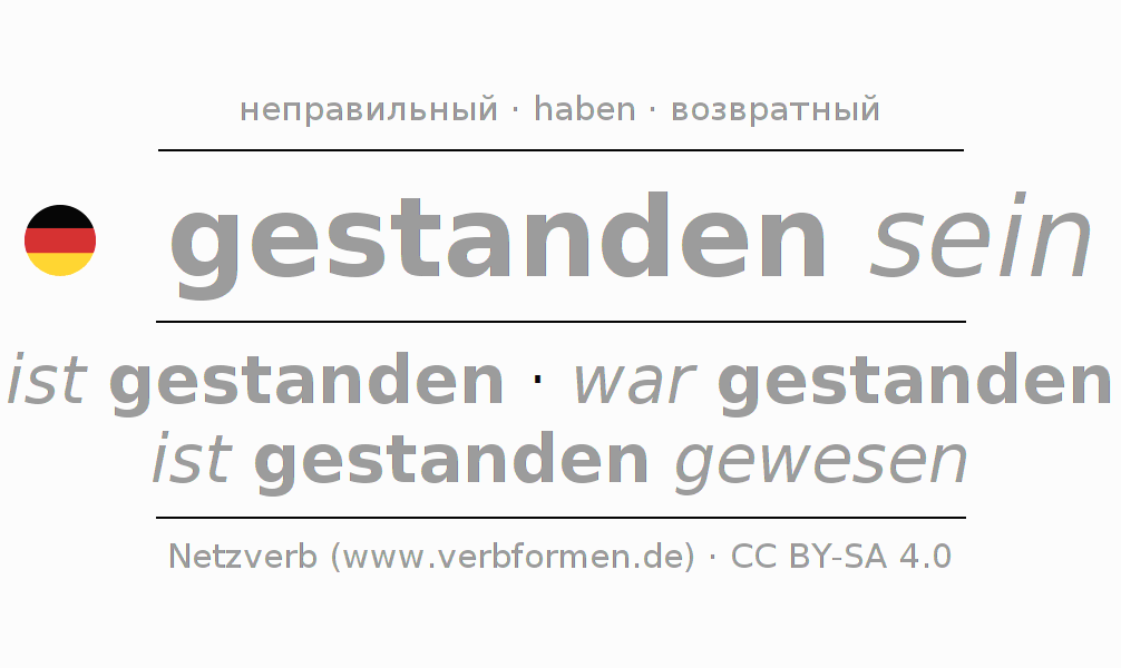 Глагол 'gestanden sein' онлайн как таблица глаголов со всеми наглядно представленными формами. Значение глагола gestanden sein таким образом является помощью для выполнения домашних заданий; подготовки к экзаменам и контрольным работам, а также к урокам немецкого языка; для обучения в вузах и при получении образования для взрослых. Именно для изучающих немецкий язык – правильное спряжение глаголов (ist gestanden - war gestanden - ist gestanden gewesen) является решающим фактором.