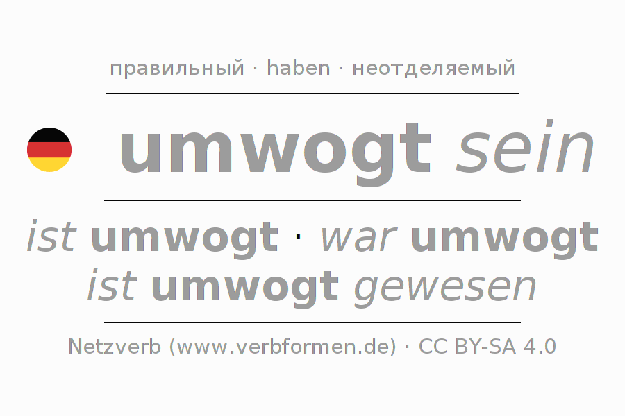 Глагол 'umwogt sein' онлайн как таблица глаголов со всеми наглядно представленными формами. Значение глагола umwogt sein таким образом является помощью для выполнения домашних заданий; подготовки к экзаменам и контрольным работам, а также к урокам немецкого языка; для обучения в вузах и при получении образования для взрослых. Именно для изучающих немецкий язык – правильное спряжение глаголов (ist umwogt - war umwogt - ist umwogt gewesen) является решающим фактором.