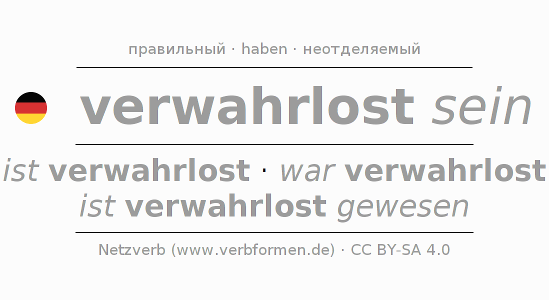 Спряжение глагола verwahrlosen (заброшенность, неухоженность) правильное. Формы глагола ist verwahrlost, war verwahrlost, ist verwahrlost gewesen. В качестве вспомогательного глагола к verwahrlosen употребляется "haben". Однако имеются временные формы со вспомогательным глаголом sein. Приставка ver- для verwahrlosen неотделяемая. Склоняется в Пассив с sein и употребляется в Главное предложение. Для лучшего понимания приводится большое количество примеров употребления глагола verwahrlosen. Для тренировки и закрепления навыков имеются также бесплатные рабочие листы по verwahrlosen. Можно не только verwahrlosen спрягать, но и все немецкие глаголы. Глагол включён в словарный запас обладателя сертификата знания немецкого языка уровня C2. Kомментарии ☆