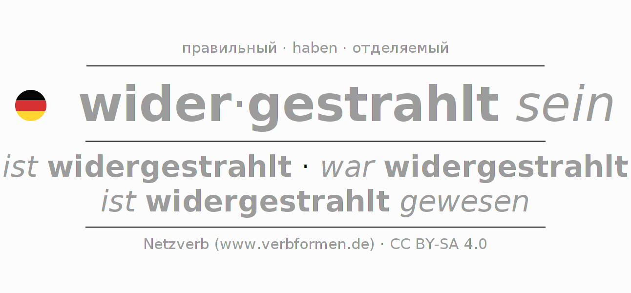 - Презенс: ich bin widergestrahlt, du bist widergestrahlt, er ist widergestrahlt, wir sind widergestrahlt, ihr seid widergestrahlt, sie sind widergestrahlt