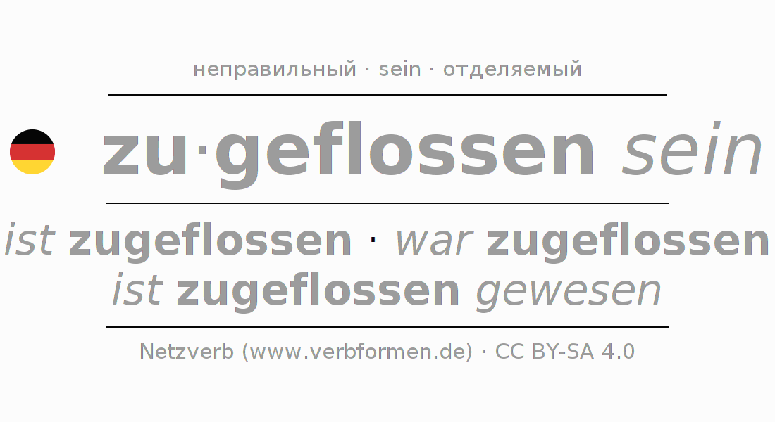 Спряжение глагола zufließen (поступать, притекать) неправильное. Формы глагола ist zugeflossen, war zugeflossen, ist zugeflossen gewesen. Чередующиеся гласные ie - o - o в корне: В качестве вспомогательного глагола к zufließen употребляется "sein". Приставка zu- для zufließen отделяемая. Склоняется в Пассив с sein и употребляется в Главное предложение. Для лучшего понимания приводится большое количество примеров употребления глагола zufließen. Для тренировки и закрепления навыков имеются также бесплатные рабочие листы по zufließen. Можно не только zufließen спрягать, но и все немецкие глаголы. Kомментарии ☆