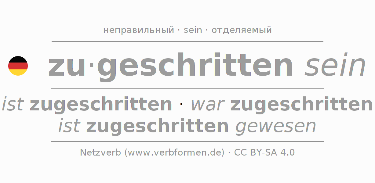 - Футурум II: ich werde zugeschritten gewesen sein, du wirst zugeschritten gewesen sein, er wird zugeschritten gewesen sein, wir werden zugeschritten gewesen sein, ihr werdet zugeschritten gewesen sein, sie werden zugeschritten gewesen sein