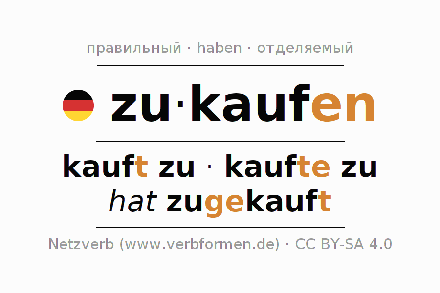 - Презенс: ich kauf(e) zu, du kaufst zu, er kauft zu, wir kaufen zu, ihr kauft zu, sie kaufen zu