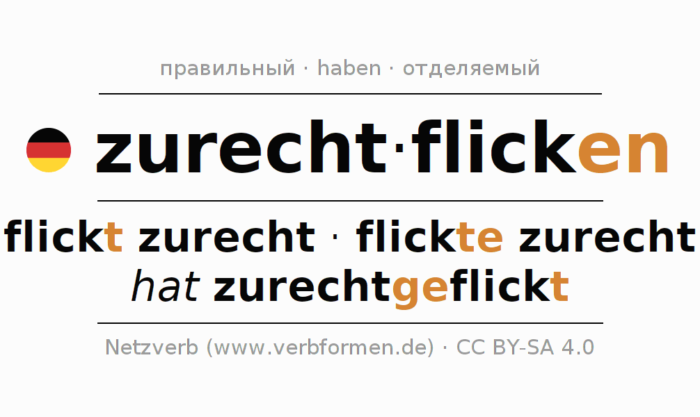 - Презенс: flick(e) (du) zurecht, flicken wir zurecht, flickt (ihr) zurecht, flicken Sie zurecht
