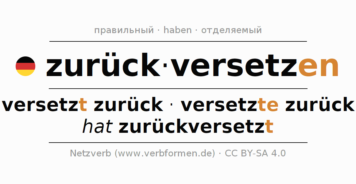 - Презенс: versetz(e) (du) zurück, versetzen wir zurück, versetzt (ihr) zurück, versetzen Sie zurück