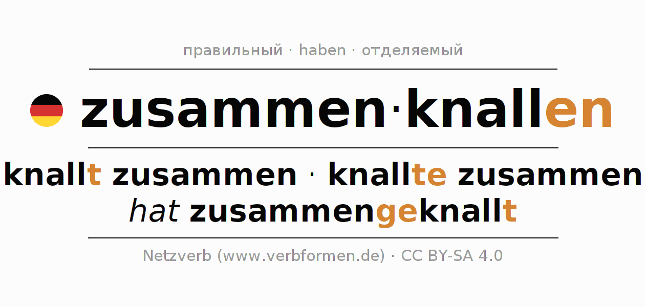 Глагол 'zusammen·knallen' онлайн как таблица глаголов со всеми наглядно представленными формами. Значение глагола zusammen·knallen таким образом является помощью для выполнения домашних заданий; подготовки к экзаменам и контрольным работам, а также к урокам немецкого языка; для обучения в вузах и при получении образования для взрослых. Именно для изучающих немецкий язык – правильное спряжение глаголов (knallt zusammen - knallte zusammen - hat zusammengeknallt) является решающим фактором.